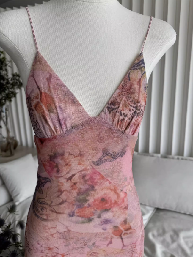 Sweet Spaghetti Strap V-neck Backless Design Floral Print A-line Women Dress HZ1024